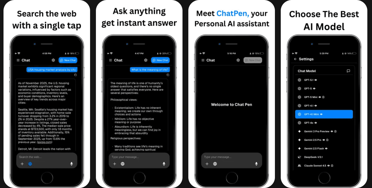 O Chat Pen – AI Assistant funciona como um assistente inteligente para auxiliar em tarefas de escrita, organização de ideias e respostas rápidas. O aplicativo permite escolher entre uma variedade de modelos populares para responder suas perguntas em uma janela de chat, tal como outros chatbots, mas sem restringir a uma empresa específica.