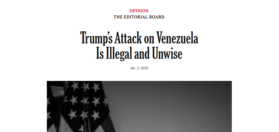 O jornal norte-americano The New York Times publicou neste sábado (3) um editorial afirmando que o ataque dos Estados Unidos à Venezuela “é ilegal e imprudente”. Assinado pelo Conselho Editorial e divulgado poucas horas após a ação das Forças Armadas americanas, o texto reconhece que o presidente venezuelano é “antidemocrático e repressivo, tendo fraudado a eleição presidencial em 2024”. No entanto, segundo a publicação, nos últimos meses o presidente Donald Trump teria mobilizado uma força militar imponente demais no Caribe apenas para ameaçar a Venezuela.
