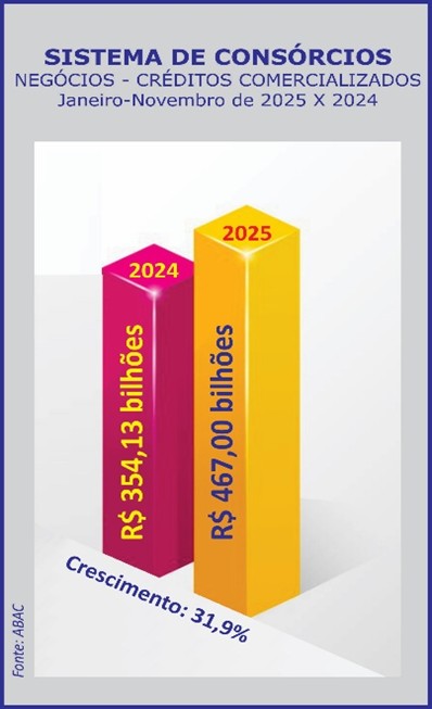 Os juros elevados e crédito mais restrito ao longo de 2025 acabaram impulsionando o sistema de consórcios. Entre janeiro e novembro, a modalidade alcançou volume financeiro de R$ 467 bilhões, um crescimento de 31,9% em relação ao mesmo período do ano anterior, impulsionado pela venda de 4,78 milhões de cotas, segundo os últimos dados da Associação Brasileira de Administradoras de Consórcios (Abac).
