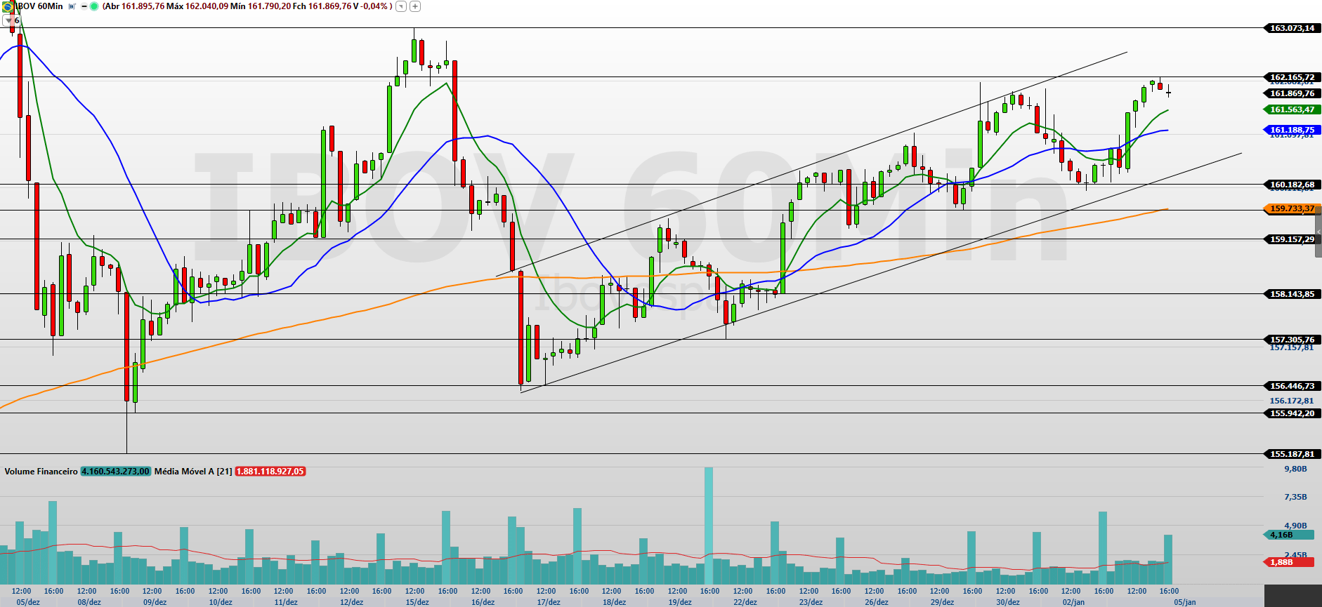 O Ibovespa encerrou a última sessão (05/01) no campo positivo, sinalizando retomada do fluxo comprador após o movimento corretivo iniciado no começo de dezembro. O índice avançou 0,83%, aos 161.869 pontos, oscilando entre a mínima de 160.214 pontos e a máxima de 162.165 pontos. Depois de renovar a máxima histórica nos 165.035 pontos no início de dezembro de 2025, o mercado passou por um período de ajuste, mas agora dá sinais de reorganização para tentar novamente a região de topo.