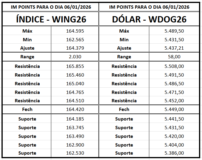 O mini-índice (WING26) fechou a última sessão (05/01) em alta de 1,00%, aos 164.420 pontos, retomando o viés positivo no curto prazo.