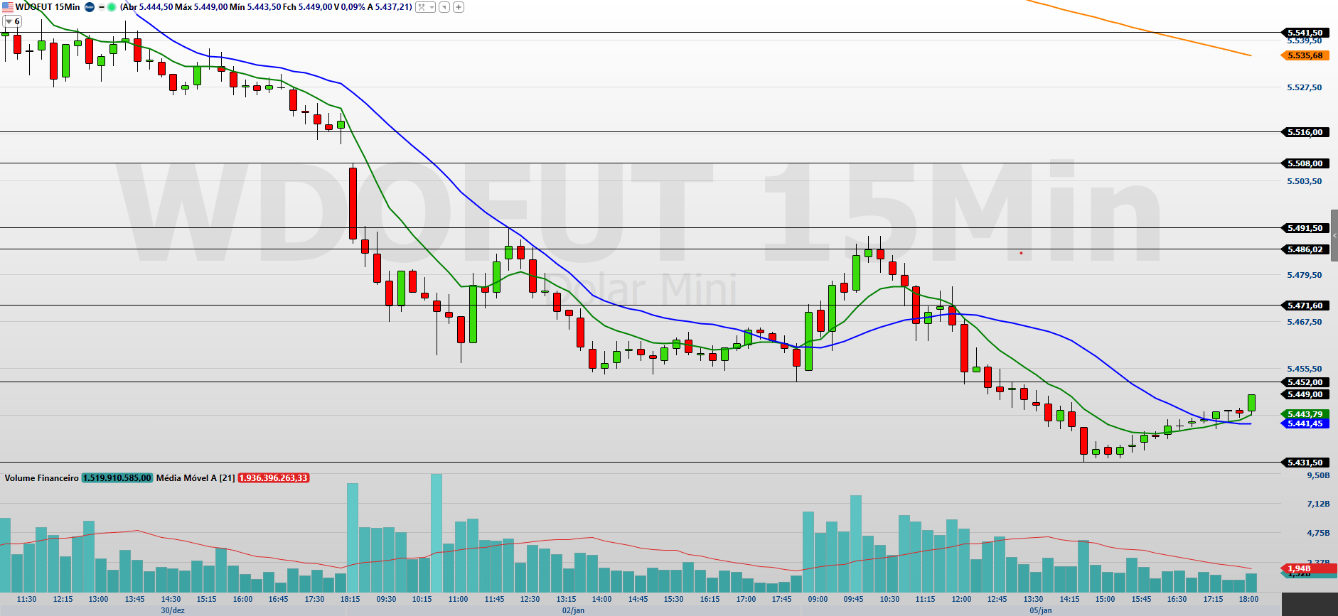 Os contratos de minidólar (WDOG26), com vencimento em fevereiro, encerraram a última sessão (05/01) em leve baixa de 0,13%, aos 5.449 pontos