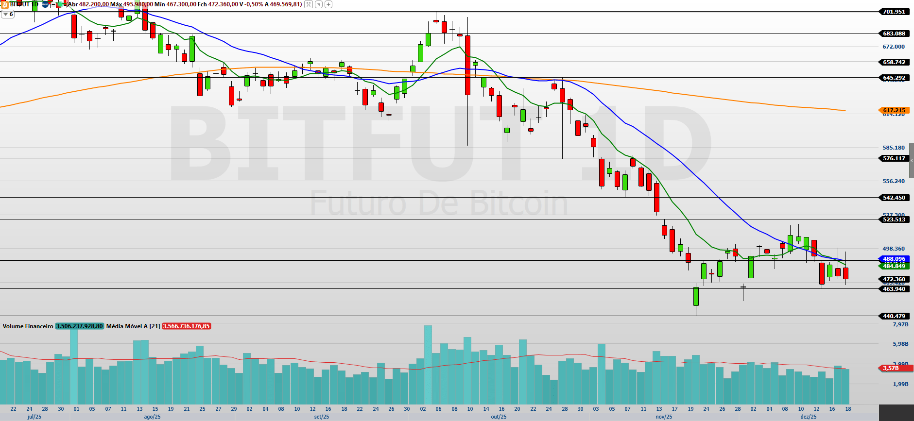 No gráfico diário, sigo observando o Bitcoin futuro dentro de um contexto predominantemente baixista. Após novas tentativas frustradas de reação, o ativo voltou a ceder e permanece negociando abaixo das médias móveis de 9 e 21 períodos, o que limita, por ora, qualquer recuperação mais consistente. O IFR (14) está em 38,94, em zona neutra, ainda sem indicar exaustão clara do movimento vendedor.