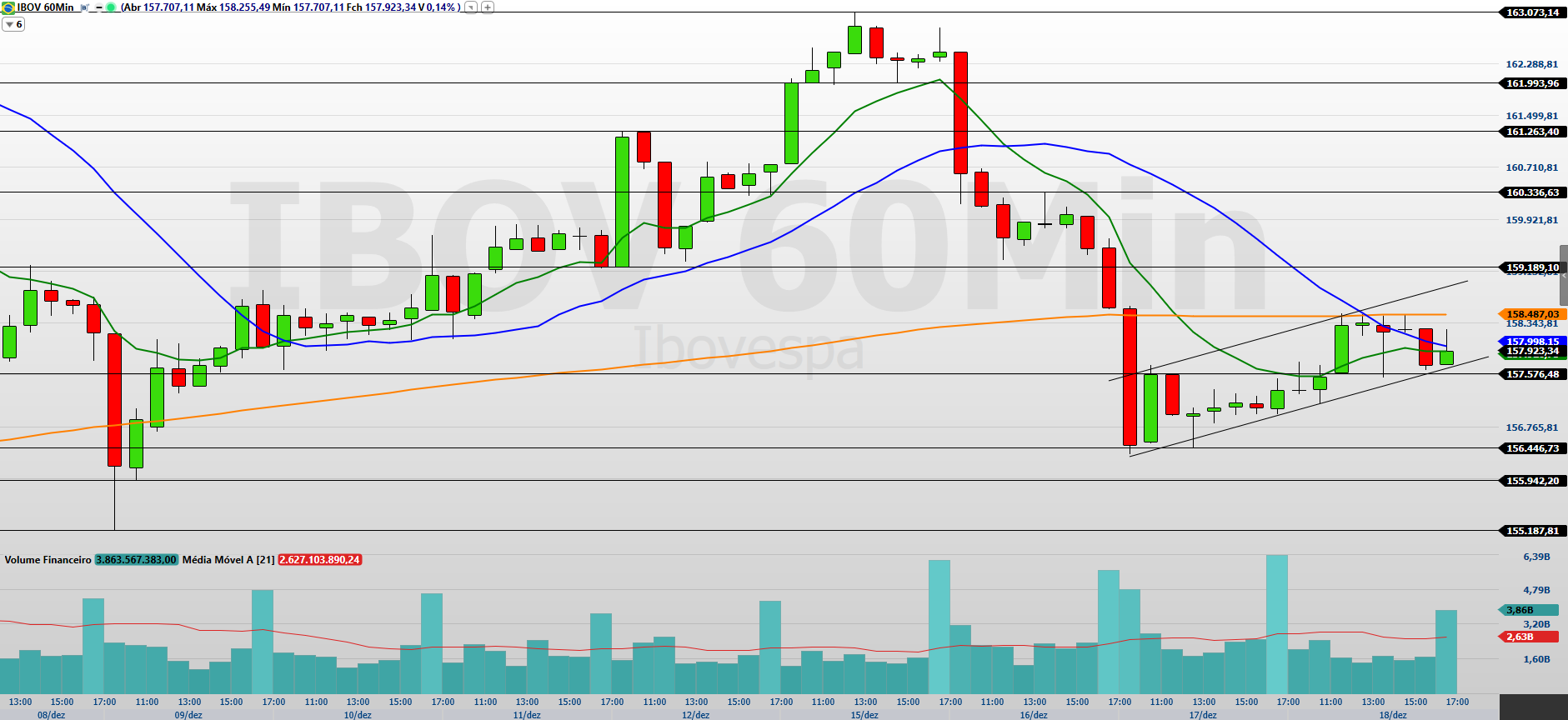 O Ibovespa fechou a última sessão (18/12) em alta, interrompendo uma sequência de duas quedas consecutivas, mas ainda sem sinal claro de retomada consistente. O índice avançou 0,39%, aos 157.923 pontos, com mínima em 157.123 pontos e máxima em 158.495 pontos. Apesar do alívio pontual, sigo observando que, após renovar a máxima histórica em 165.035 pontos, o mercado passou a sofrer com a entrada de fluxo vendedor, o que mantém a recuperação recente sob risco.