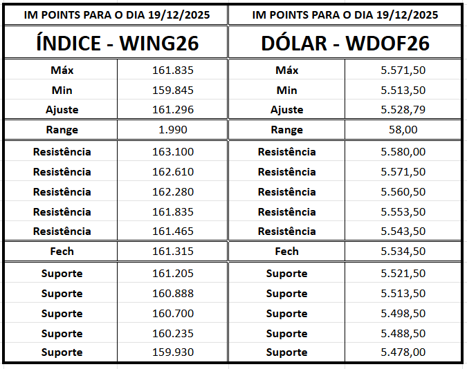 O mini-índice (WING26) encerrou a última sessão (18/12) em alta de 0,67%, aos 161.315 pontos, mantendo um viés levemente construtivo no curto prazo.