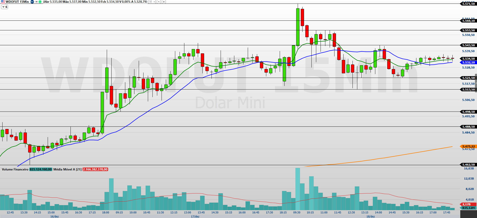 Os contratos de minidólar (WDOF26), com vencimento em janeiro, encerraram a última sessão (18/12) em estabilidade (0,00%), aos 5.534,5 pontos.