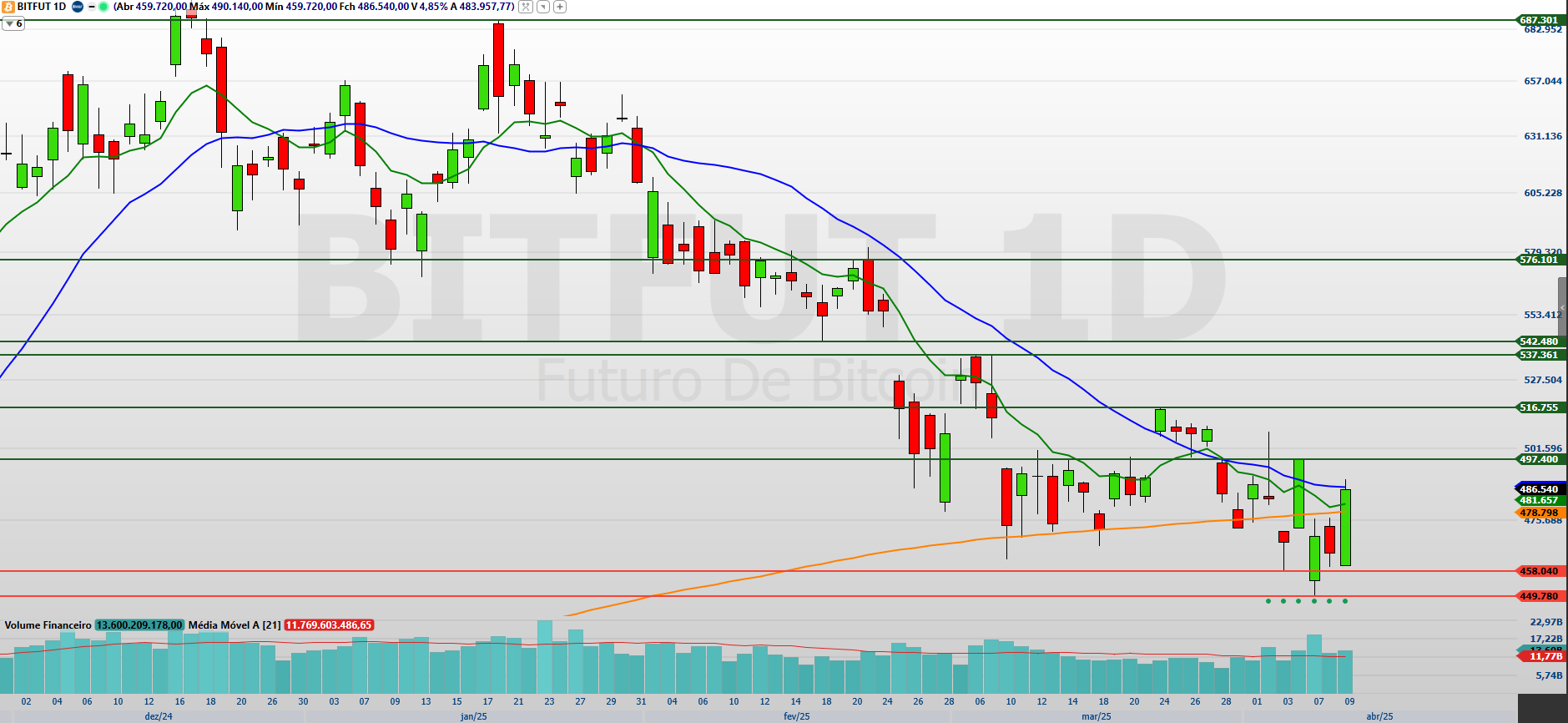 Os contratos futuros de Bitcoin (BITJ25), com vencimento em abril, encerraram a última sessão em forte alta de 4,85%, cotados a 486.540 pontos, após dois pregões consecutivos de baixa. A recuperação técnica recoloca o ativo acima de médias importantes e reacende a expectativa de uma possível retomada do movimento altista no curto prazo.