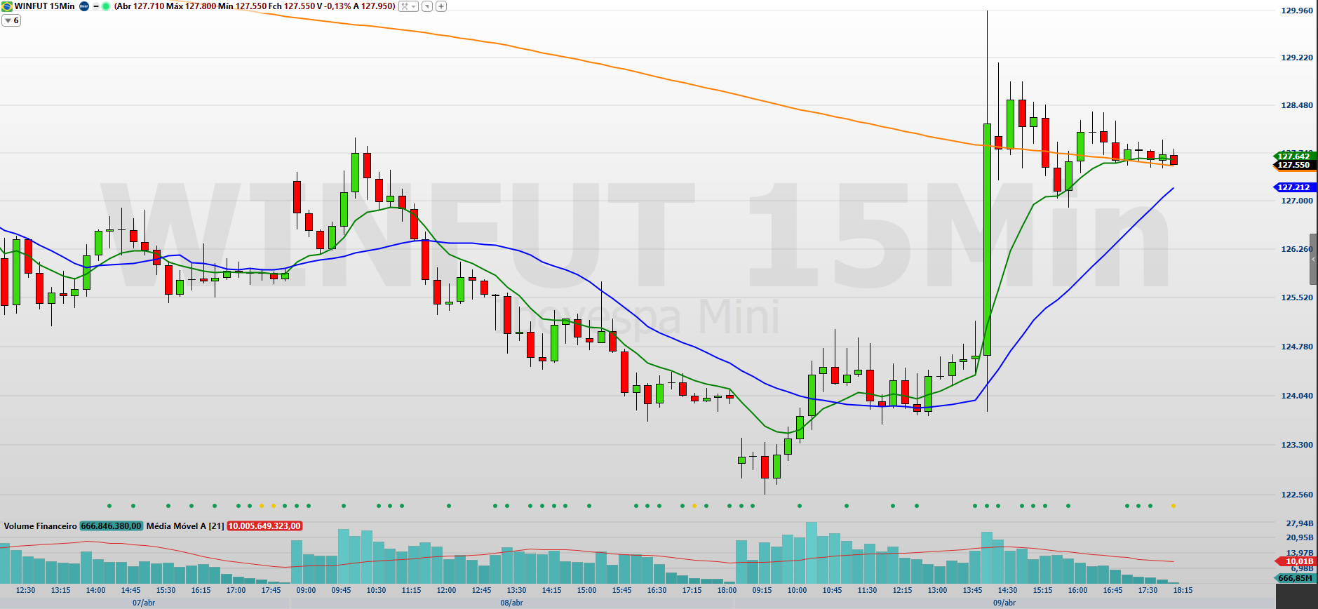 A forte reação compradora da véspera marca um possível ponto de inflexão após a sequência de quedas, mas o movimento precisa ser confirmado com o rompimento das próximas resistências. No gráfico de 15 minutos, o destaque fica para a faixa de 127.210/126.570, que será a principal linha de defesa dos compradores nesta quinta-feira. Já para seguir avançando, será necessário romper os 129.000 pontos.