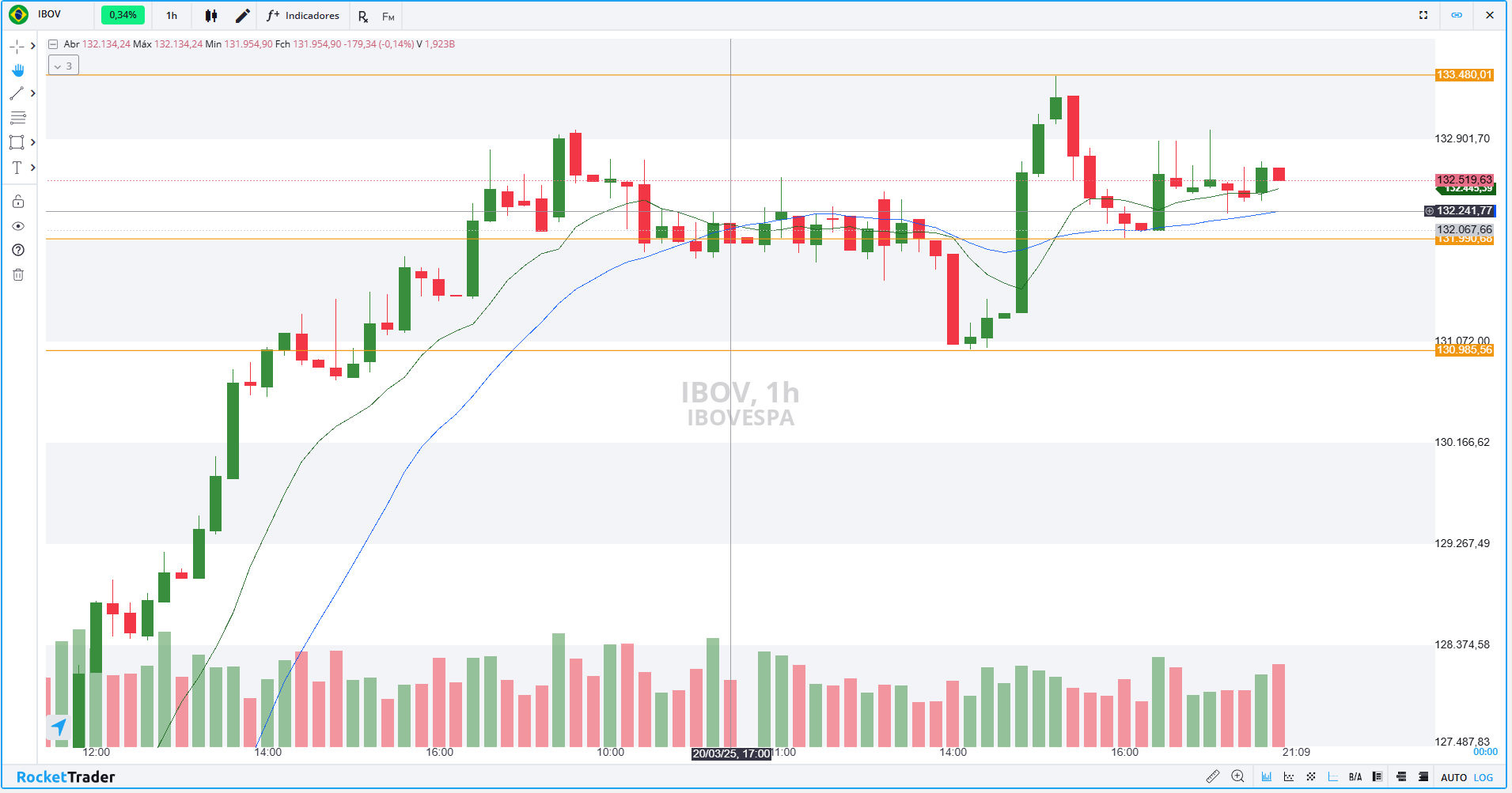 No gráfico de 60 minutos, o índice opera de forma lateral, reforçando a necessidade de atenção às extremidades dessa consolidação. Caso supere a resistência em 132.985/133.470 pontos, o fluxo comprador pode se fortalecer. Já uma perda do suporte em 131.815/131.040 pontos pode abrir espaço para uma realização de lucros mais intensa.