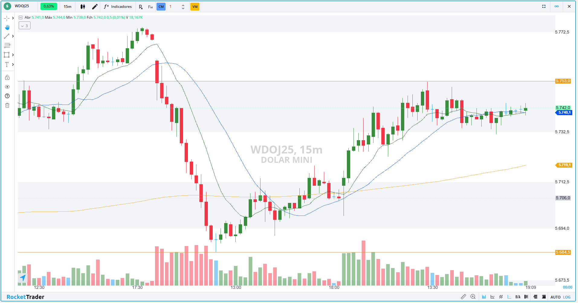 O minidólar seguiu o movimento de alta iniciado na terça-feira e fechou a última sessão negociando acima das médias de 9 e 21 períodos no gráfico de 15 minutos. Esse avanço indica um viés positivo no curto prazo, mas para dar continuidade à alta, será fundamental a entrada de volume comprador que sustente a superação da resistência em 5.750/5.761 pontos. Por outro lado, caso o suporte em 5.731/5.719 pontos seja perdido, o fluxo vendedor pode se intensificar.