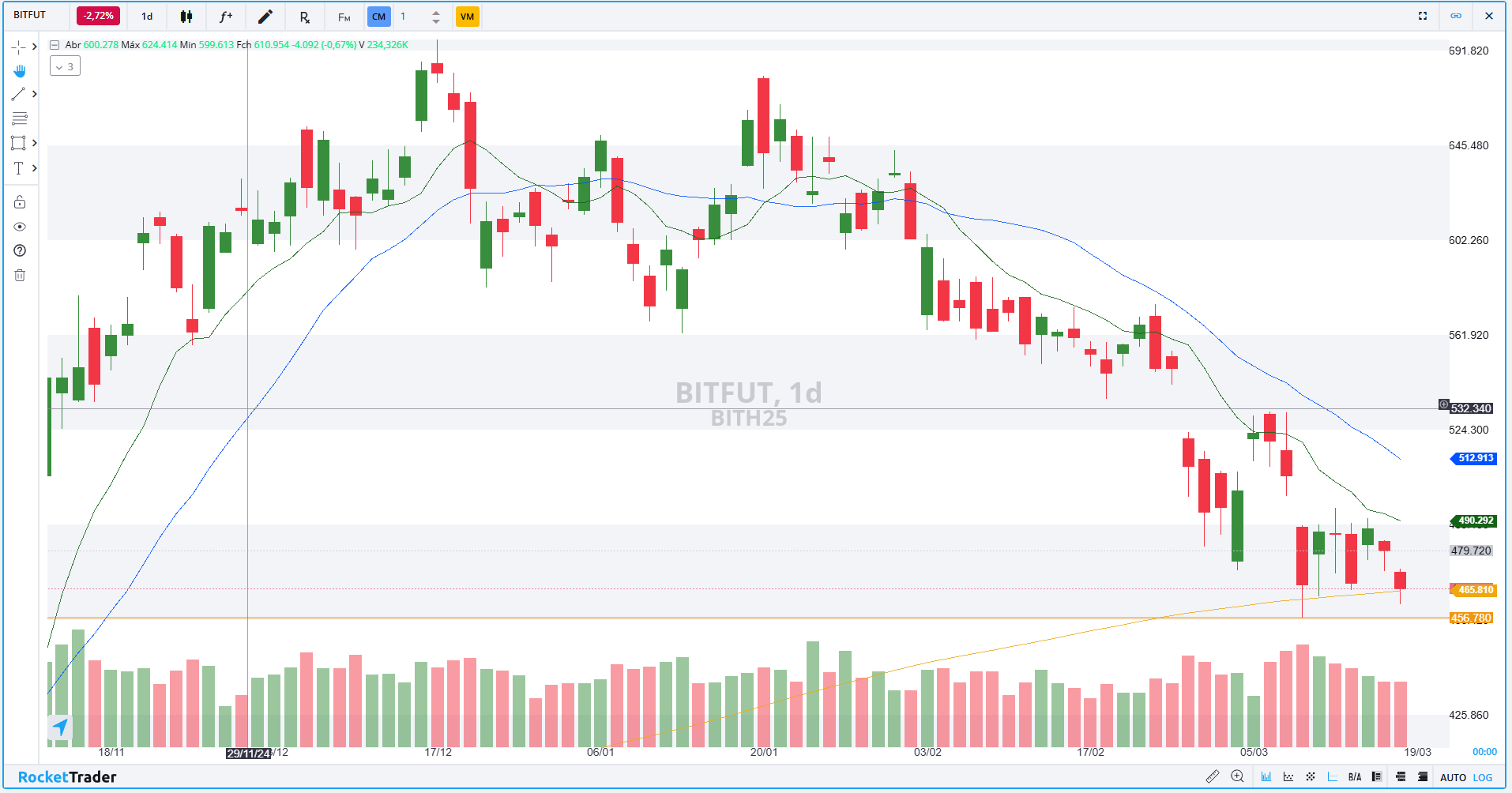 Os contratos futuros de Bitcoin (BITH25), com vencimento em março, encerraram a última sessão em queda de 2,72%, aos 466.660 pontos, mantendo o viés de baixa.
