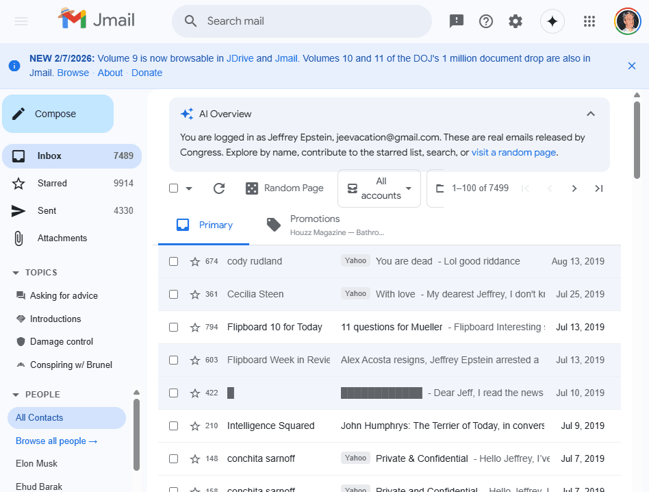 O JMail é um projeto desenvolvido por Riley Walz e Luke Igel. A proposta é apresentar os documentos do caso Epstein em uma interface muito semelhante ao Gmail, permitindo navegar pelo conteúdo como se o usuário tivesse acesso direto à conta jeevacation@gmail.