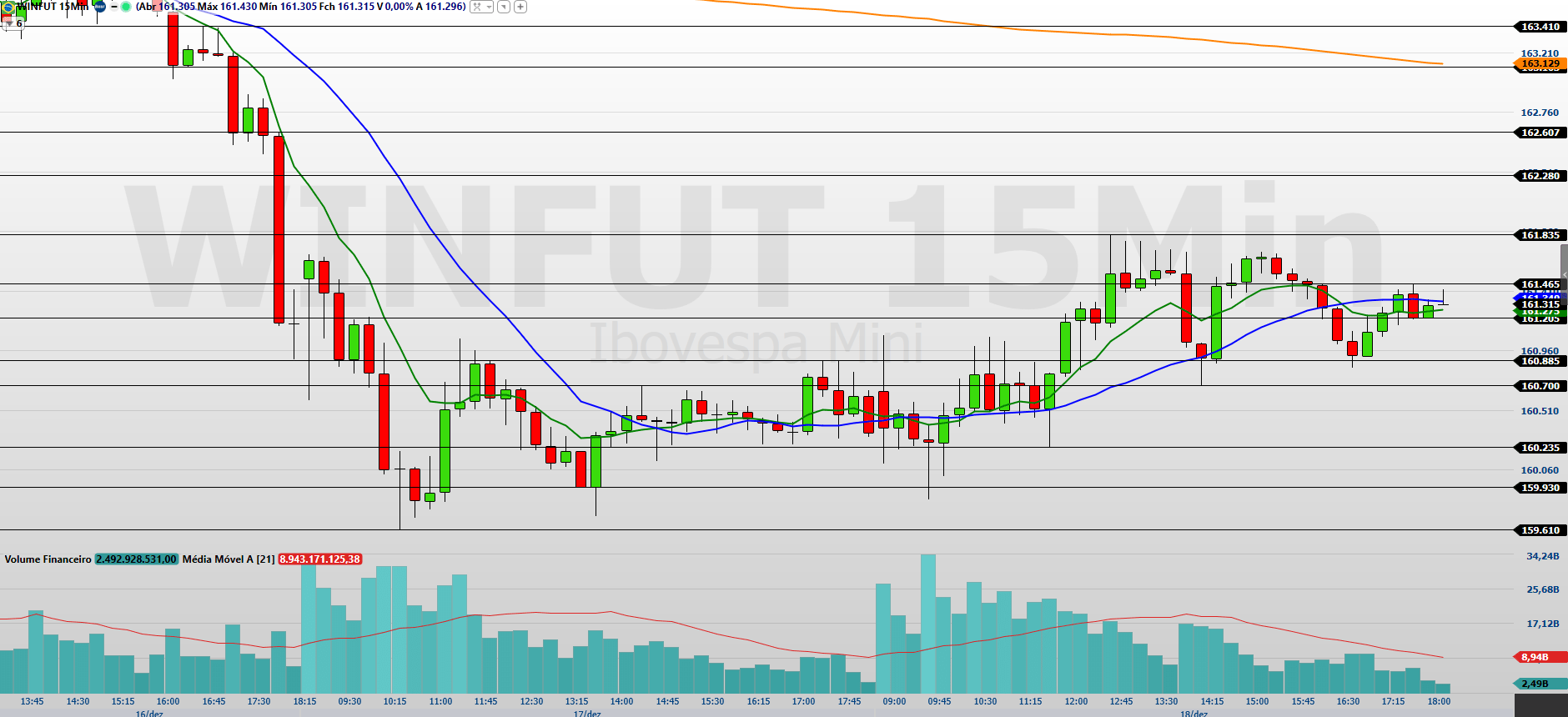 No 15 minutos, o mini-índice fechou em alta, mas ainda negocia entre as médias de 9 e 21 períodos, indicando equilíbrio entre compradores e vendedores. Para dar sequência ao movimento altista, será fundamental superar 161.465/161.835, abrindo espaço para 162.280/162.610 e, em extensão, 163.100/163.410.