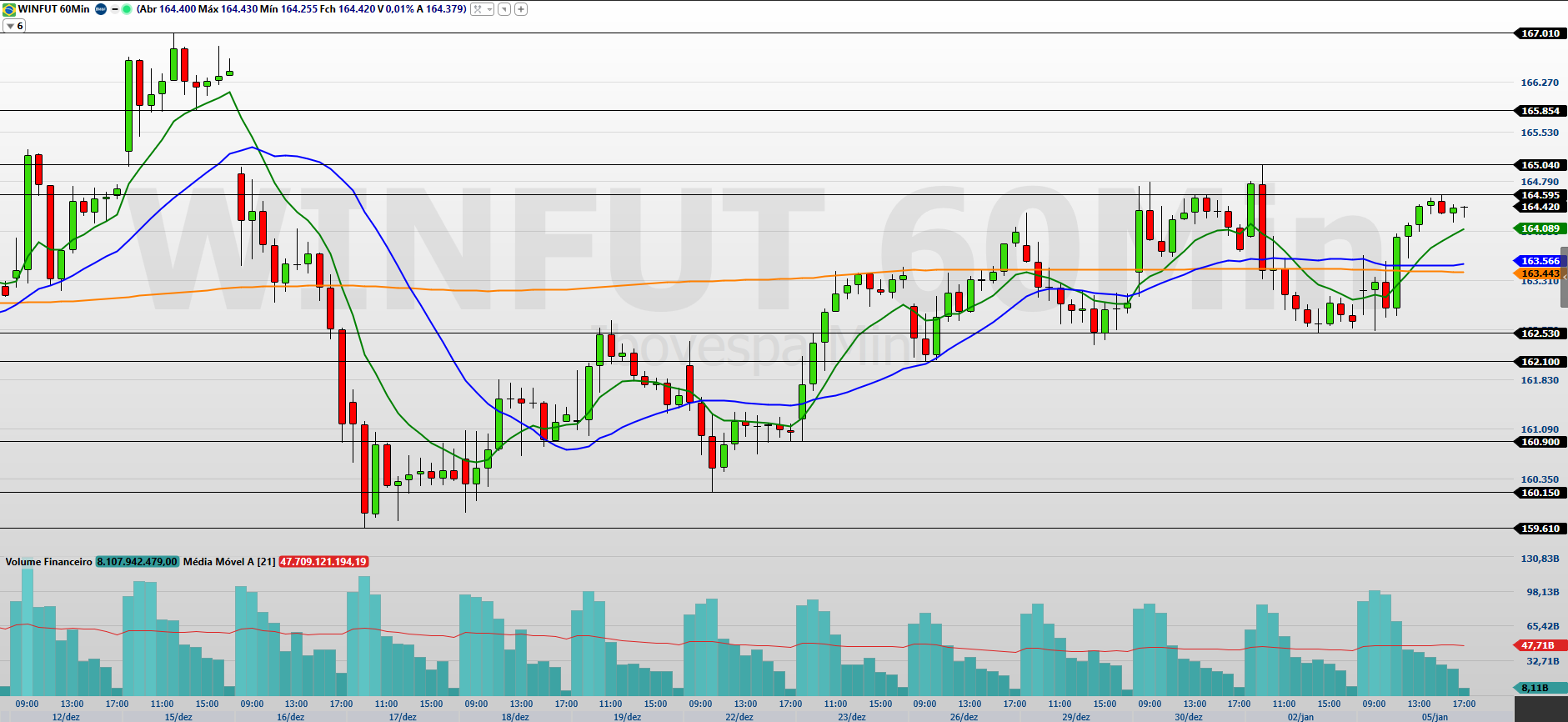 Nos 60 minutos, o mini-índice também fechou em alta e segue negociando acima das médias de 9, 21 e 200 períodos, o que sustenta o viés positivo no curto prazo.