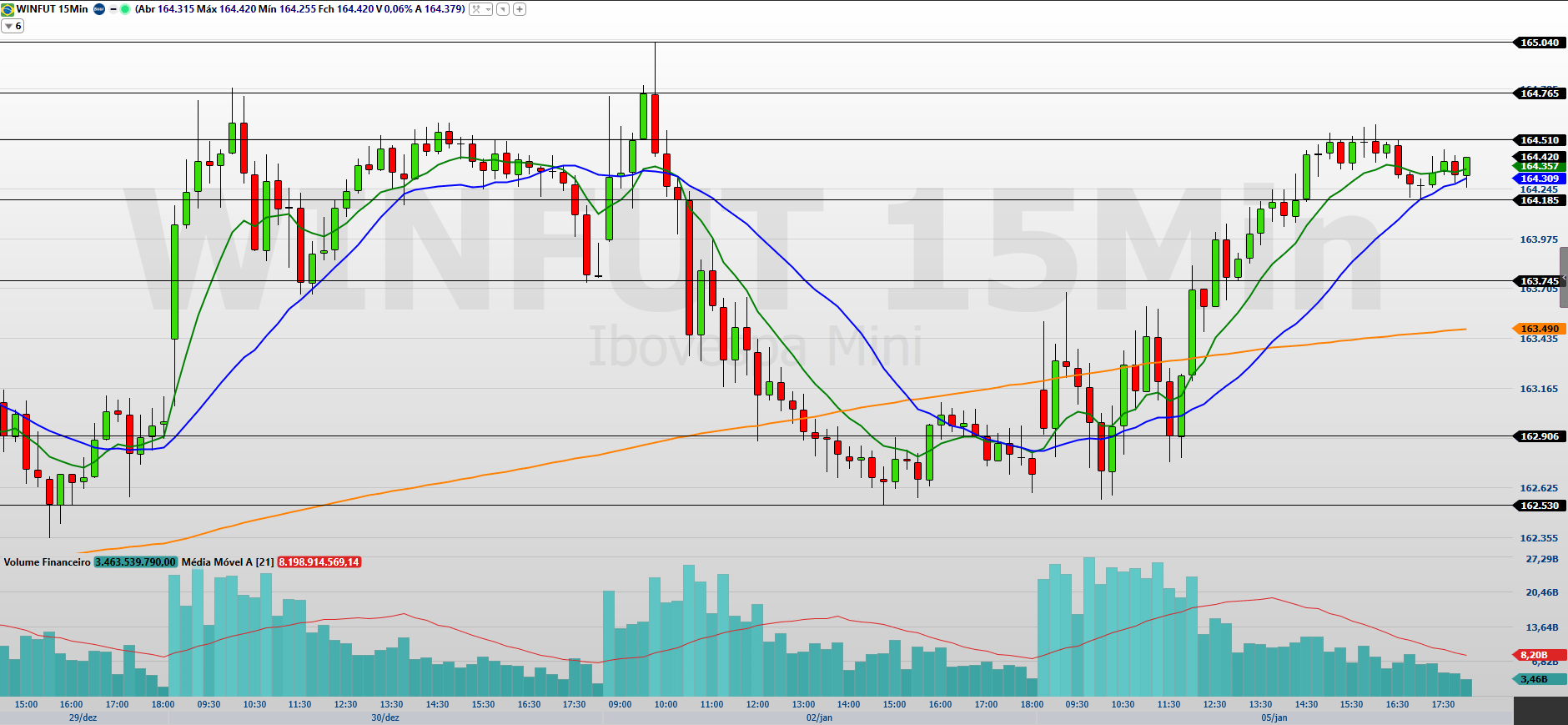 No 15 minutos, o mini-índice fechou em alta e voltou a negociar acima das médias de 9 e 21 períodos, reforçando o fluxo comprador no curto prazo. Para que esse movimento tenha continuidade, será fundamental a superação de 164.510/164.765, abrindo espaço para avanços em 165.040/165.460 e, mais adiante, 165.855/166.115.