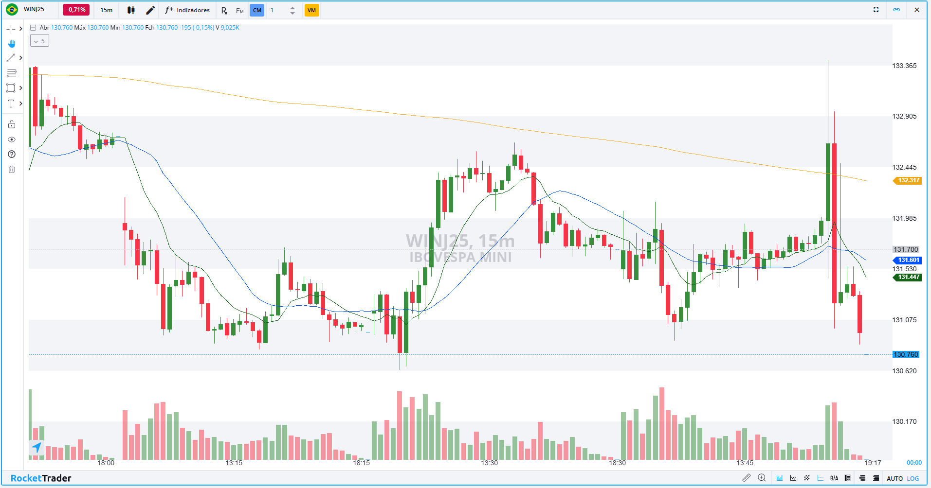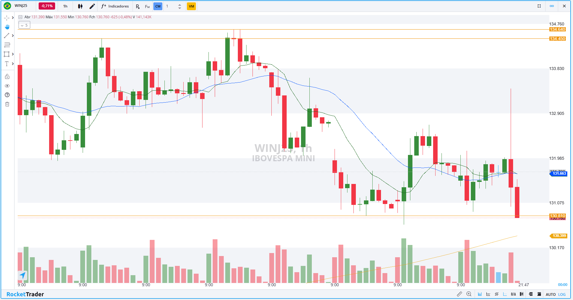 Os contratos de mini-índice (WINJ25), com vencimento em abril, encerraram a última sessão em queda de 0,57%, aos 130.760 pontos.