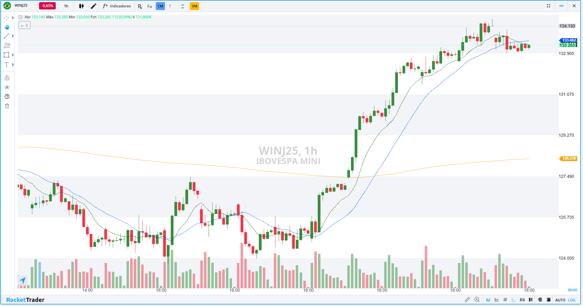 Os contratos de mini-índice (WINJ25), com vencimento em abril, fecharam a última sessão em queda de 0,66%, aos 133.265 pontos, encerrando uma sequência de cinco pregões de alta. No curto prazo, os suportes estão em 133.190/132.940, 132.530/132.245 e 131.900/131.490 pontos, enquanto as resistências situam-se em 133.410/133.955, 134.345/134.600 e 135.000/135.550 pontos.