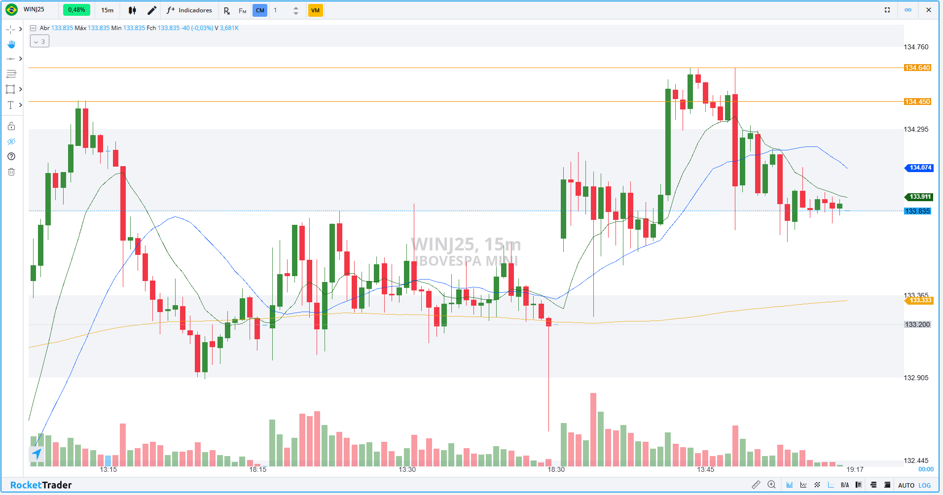Os contratos de mini-índice (WINJ25), com vencimento em abril, encerraram a última sessão com alta de 0,51%, aos 133.835 pontos.