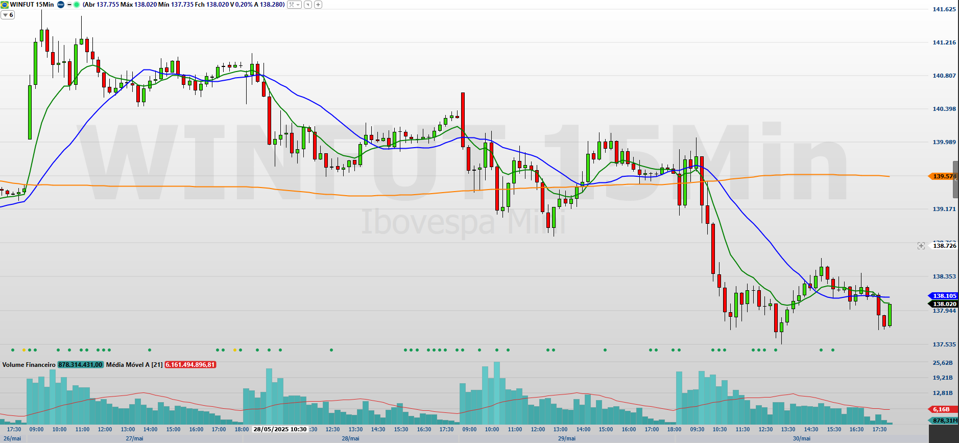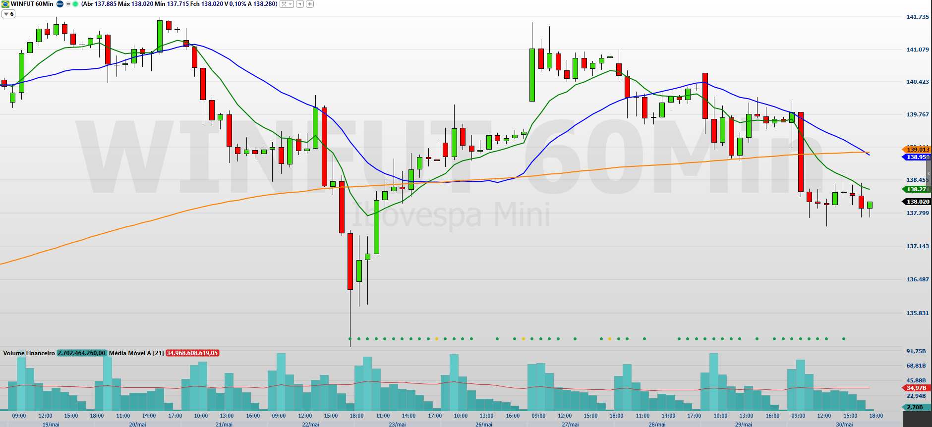 Os contratos do mini-índice (WINM25, vencimento em junho) fecharam a última sessão com forte queda de 1,14%, cotados a 138.020 pontos, acumulando a terceira baixa consecutiva.