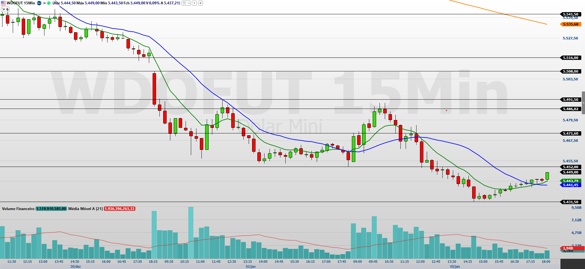 No gráfico de 15 minutos, observo que o minidólar fechou a última sessão em baixa, mas permanece negociando acima das médias móveis de 9 e 21 períodos, o que mantém viva a possibilidade de um repique técnico no curto prazo. Para que esse movimento ganhe tração, será essencial a entrada de volume comprador capaz de romper a resistência em 5.452/5.471,5 pontos. Se confirmada a quebra, os próximos alvos passam a ser 5.486,5/5.491,5 pontos, com extensão até 5.508/5.516 pontos.