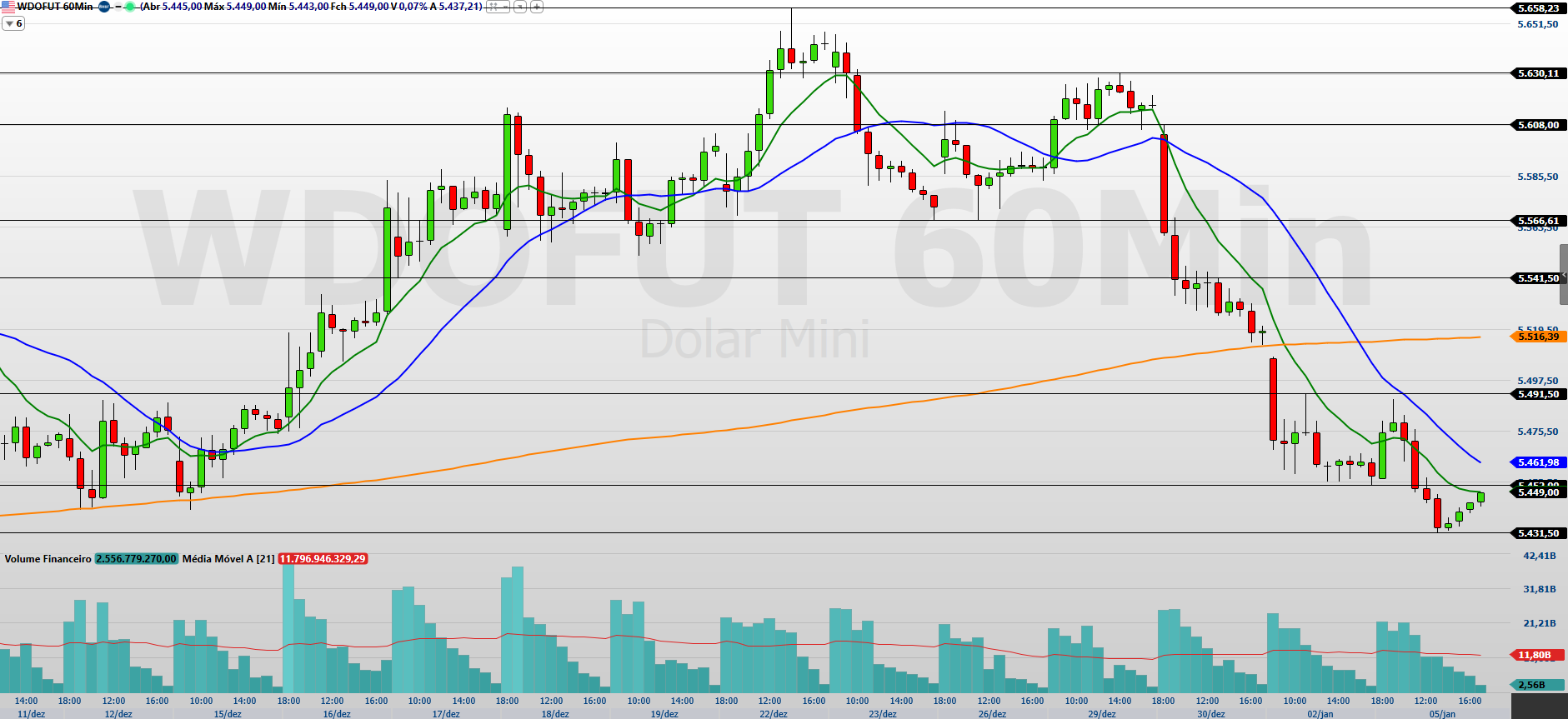 No gráfico de 60 minutos, o minidólar permanece negociando abaixo das médias móveis de 9 e 21 períodos, reforçando a leitura de cautela no curto prazo.