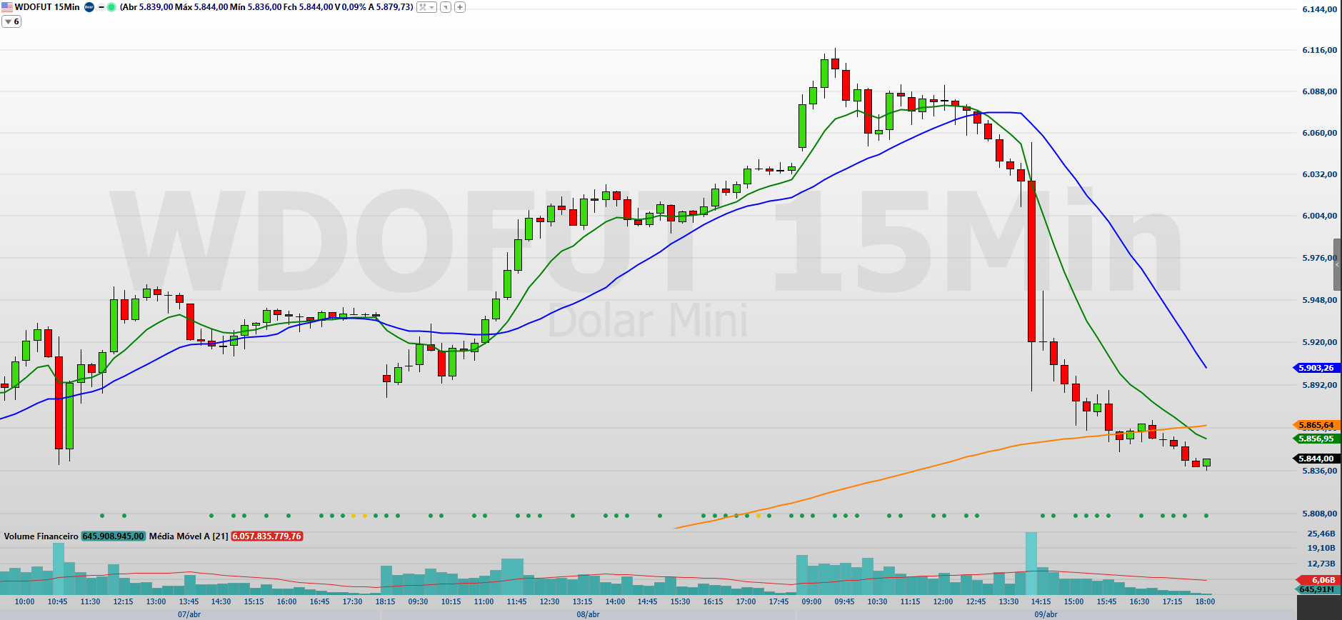 A sessão de quarta-feira foi marcada por forte volatilidade e predominância do fluxo vendedor. O minidólar recuou com intensidade, refletindo uma correção após a sequência de altas anteriores. No gráfico de 15 minutos, o ativo rompeu as médias de 9, 21 e 200 períodos, encerrando o pregão abaixo delas, o que reforça a fraqueza no curtíssimo prazo.