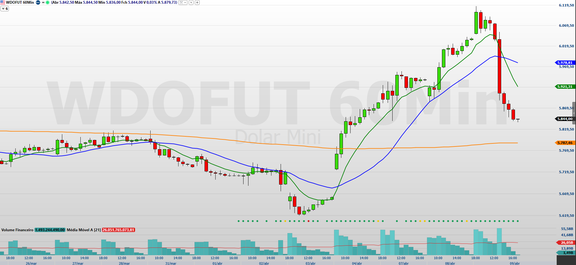 O gráfico de 60 minutos reforça a deterioração técnica vista no intraday. Após um período de forte valorização, o minidólar inverteu a tendência e fechou a última sessão com um movimento de queda acentuado. O ativo rompeu as médias de 9 e 21 períodos, e agora opera abaixo da média de 200 períodos, o que intensifica o viés de baixa.