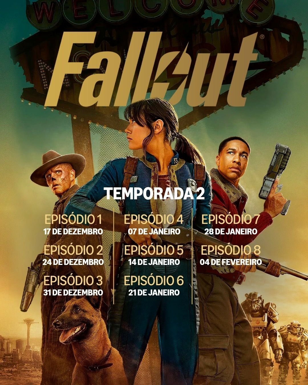 Caso você pretenda acompanhar a Temporada 2 de Fallout se desviando de spoilers, é bom se preparar para madrugar — ou ir dormir bastante tarde. Segundo a Prime Video, no Brasil os novos episódios vão ser liberados sempre a partir das 23h, no horário de Brasília, chegando um dia antes do calendário oficial. Confira as datas: