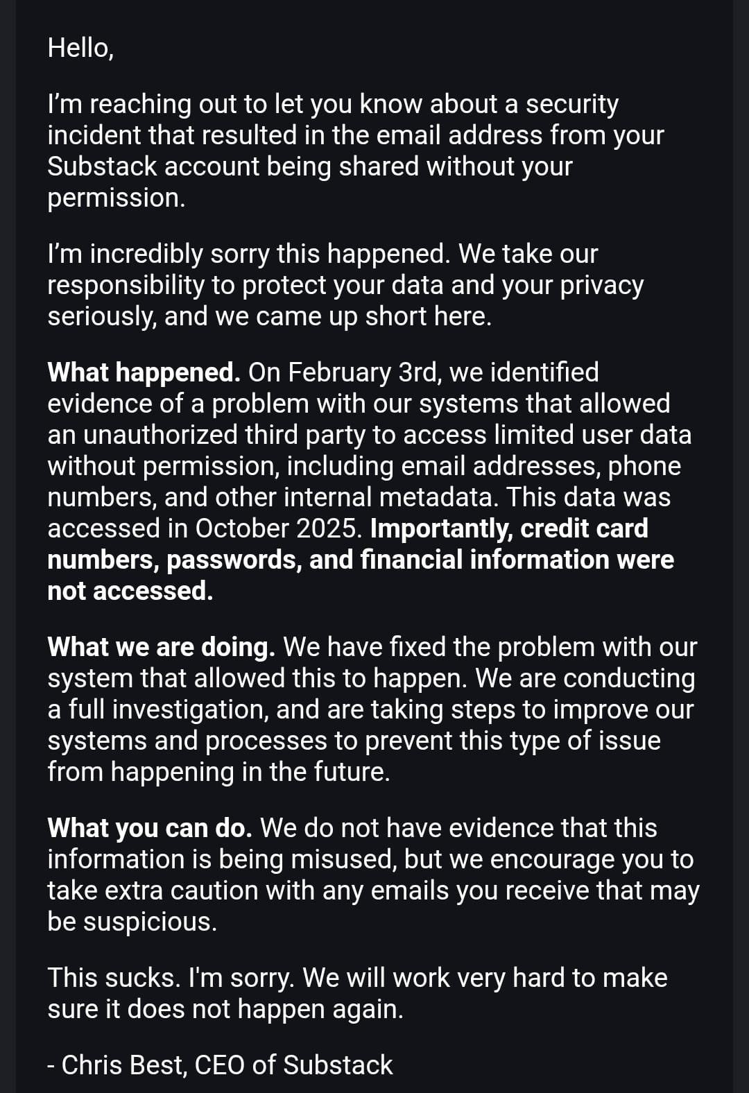 Segundo o Daily Dark Web, a postagem alega que realizou uma raspagem de dados ilegal no Substack no final de 2025 e vazou dados de mais de 697 mil usuários. O pacote de documentos conteria informações como nome completo, email, telefone, IDs de usuários, descrição do perfil, imagem da conta e perfis associados em redes sociais.