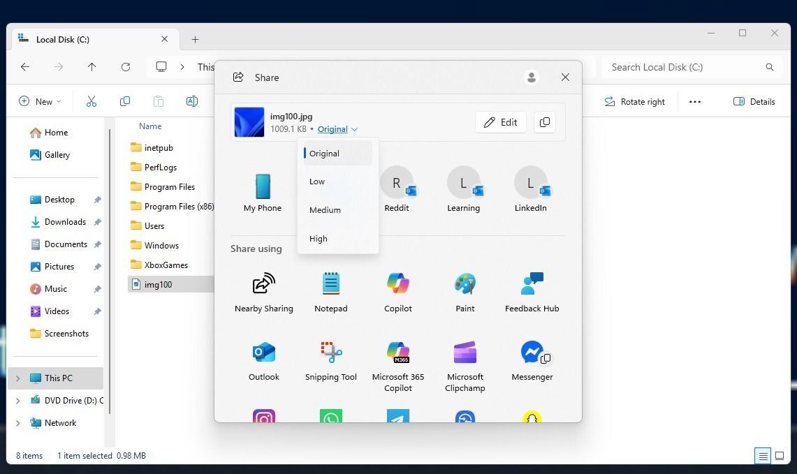 Vale notar que essa é uma possibilidade graças à ferramenta Share UI de compartilhamento disponível no Windows 11. Antes disso, para realizar essa compactação, o usuário precisava redimensionar a imagem no Paint, Photoshop ou outro editor de vídeo, mas que automaticamente também geraria uma resolução menor.